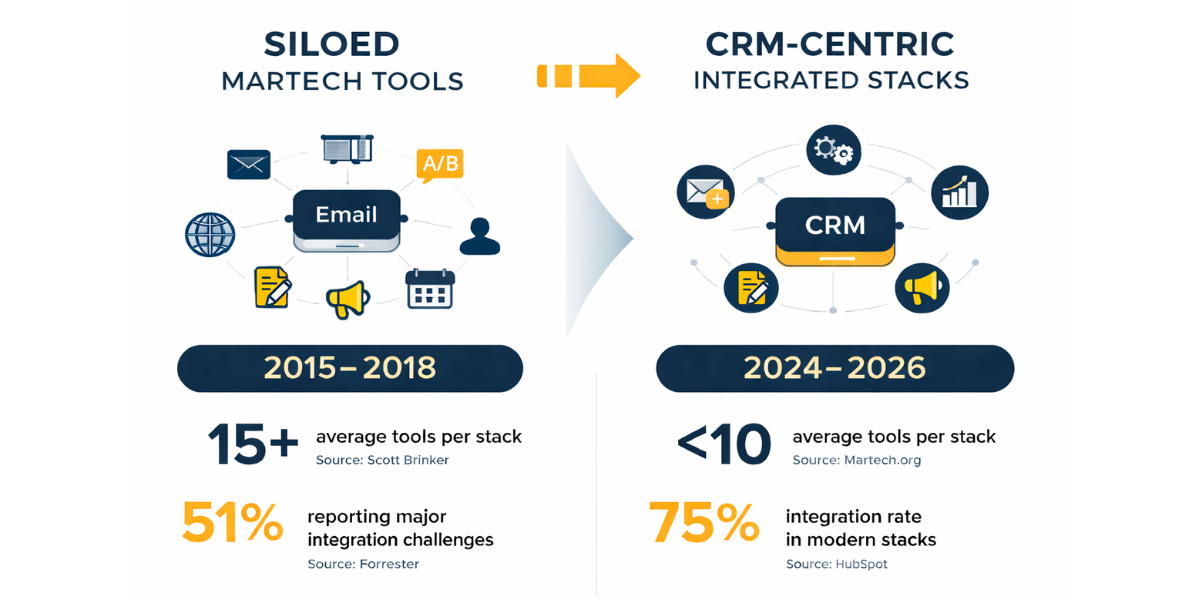 The data tells a clear story: marketing automation platforms (MAPs) have declined from 30.7% to 26% as the stack’s center (State of Martech 2025). Why? Because the functionality that used to require a separate MAP is now embedded in CRMs.