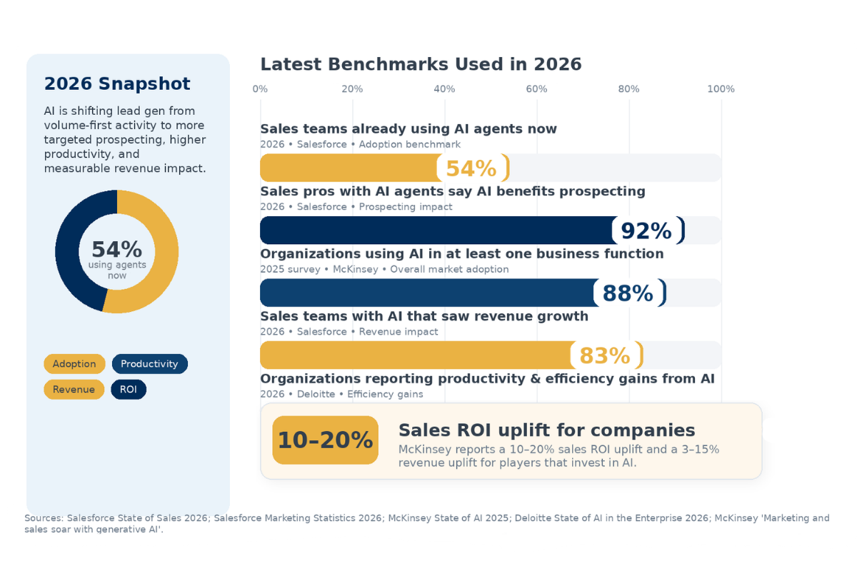 64% of marketers are using generative AI for lead generation and other marketing processes, with another 35% trialing or planning to trial (Warmly.ai, 2025-2026). That means only 1% of marketers have zero AI lead generation plans on their radar. If you’re in that 1%, this is your wake-up call.