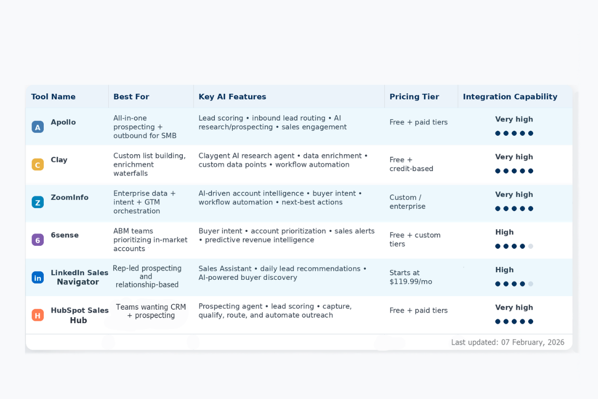 | ZoomInfo | Enterprise data accuracy | $$$ | Intent signals | Strong (Salesforce, HubSpot) |
