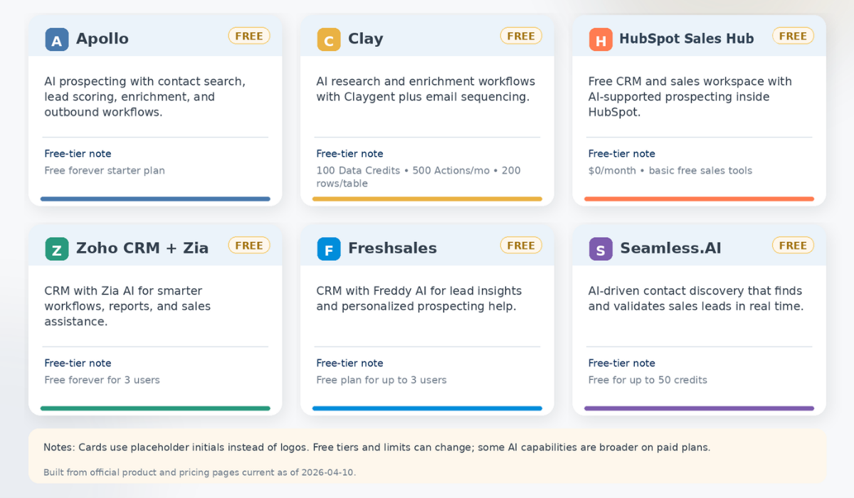 Apollo.io free tier: Limited but functional prospecting. You get a certain number of credits monthly – enough to validate the approach before investing in paid.