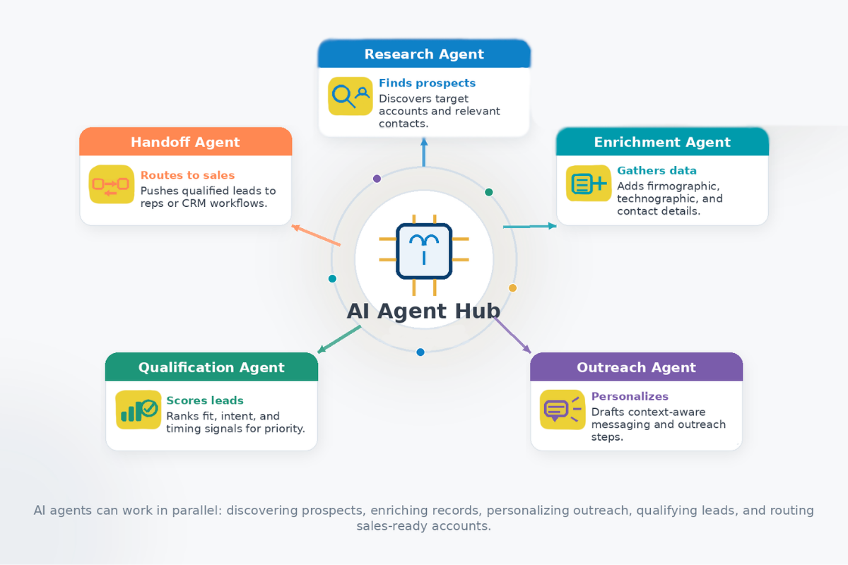 The next frontier is agentic AI: systems that execute entire workflows autonomously. Identify prospect. Research company. Enrich profile. Draft personalized email. Monitor response. Schedule meeting. No human in the loop until the meeting is booked.
