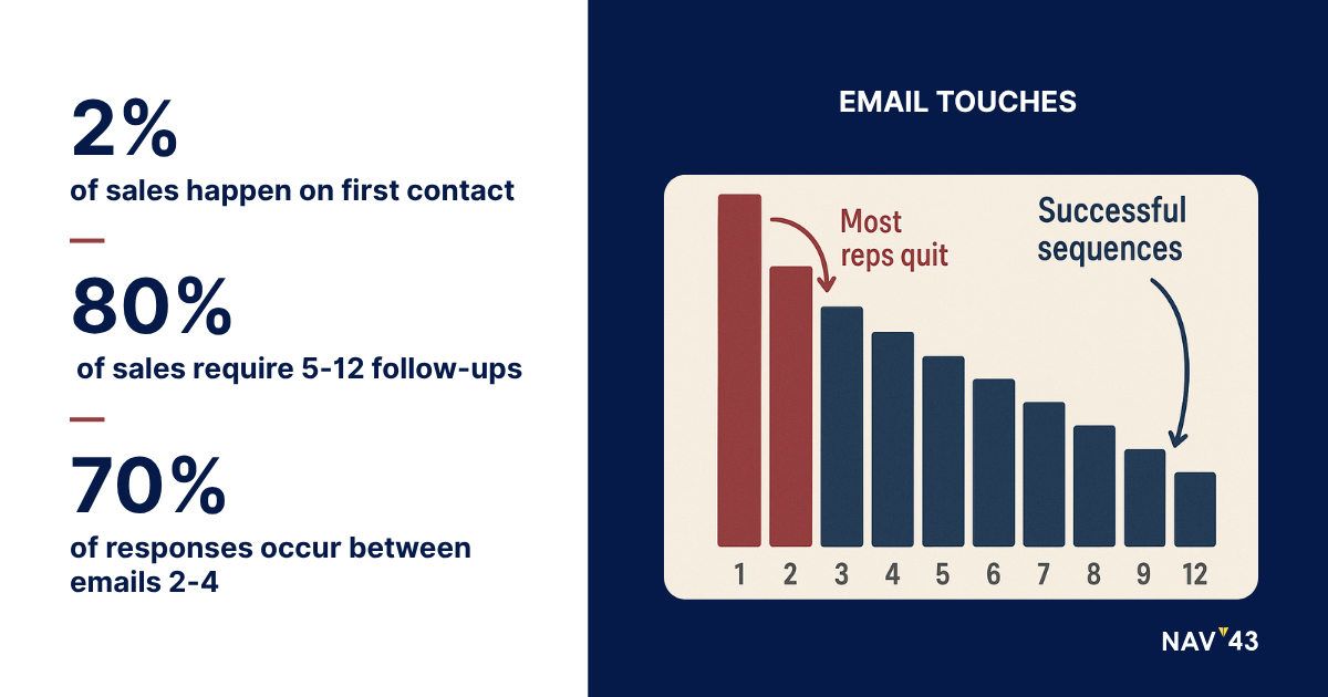 Here’s a number that should make you uncomfortable: only 2% of sales happen on the first contact. Yet according to HubSpot and Yesware data, 70% of sales reps quit after sending just one email. That’s like running the first mile of a marathon and calling it done. The sales rep plays a crucial role in consistent follow-up and personalized communication throughout the customer journey, ensuring leads receive the attention and engagement needed to move forward.