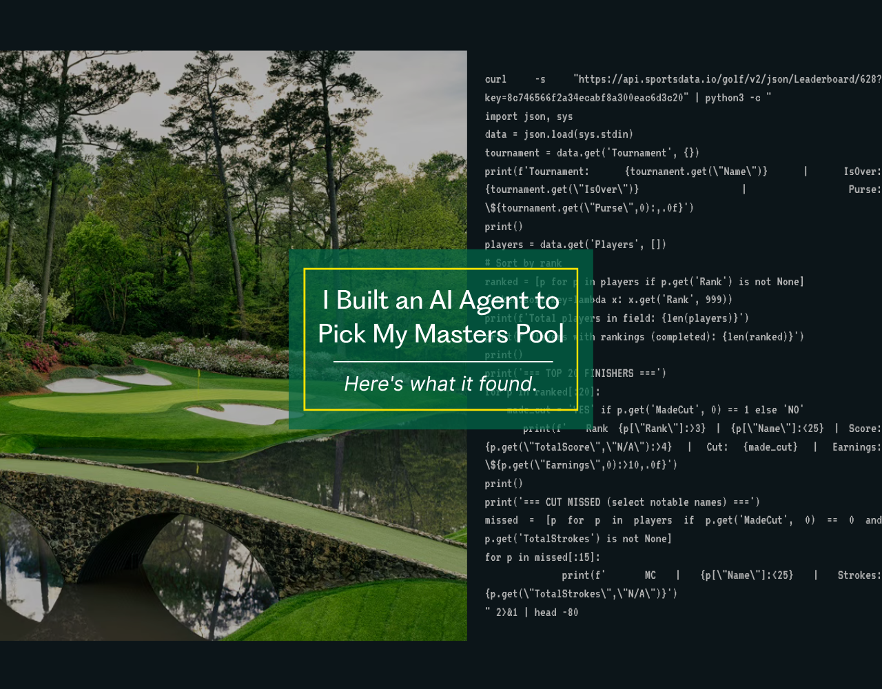 Instead of going with my gut (which historically has been less accurate than a random number generator at Masters pool time), I built a proper scoring model — powered by a live sports API, a large language model, and the same structured thinking I apply to every other data problem I work on professionally. The goal was simple: stop guessing, start reasoning, and make the most defensible Masters pool picks I possibly could.