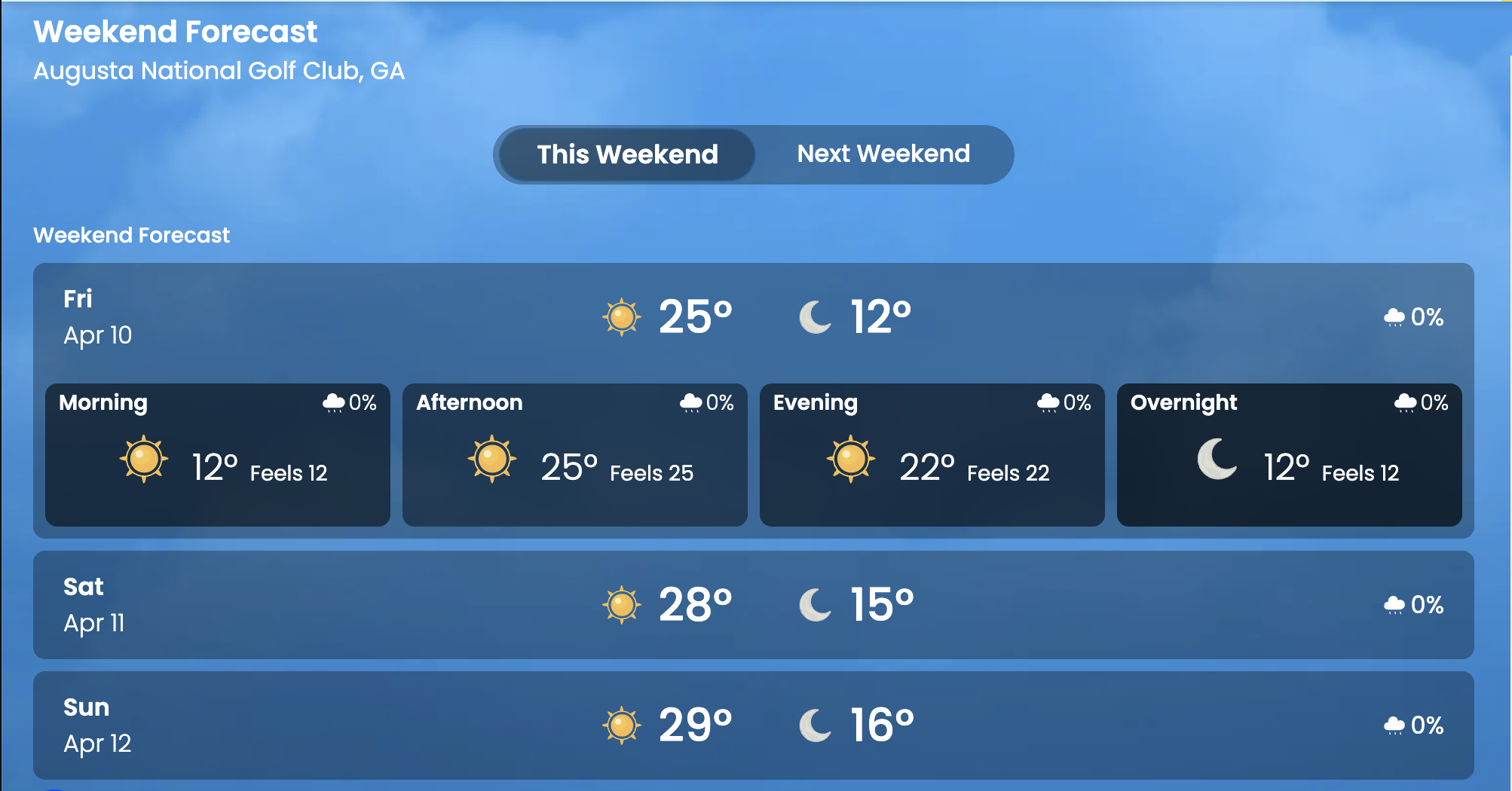 - Sunday (final round): 84°F, 0% rain, winds calming to 5–6 mph