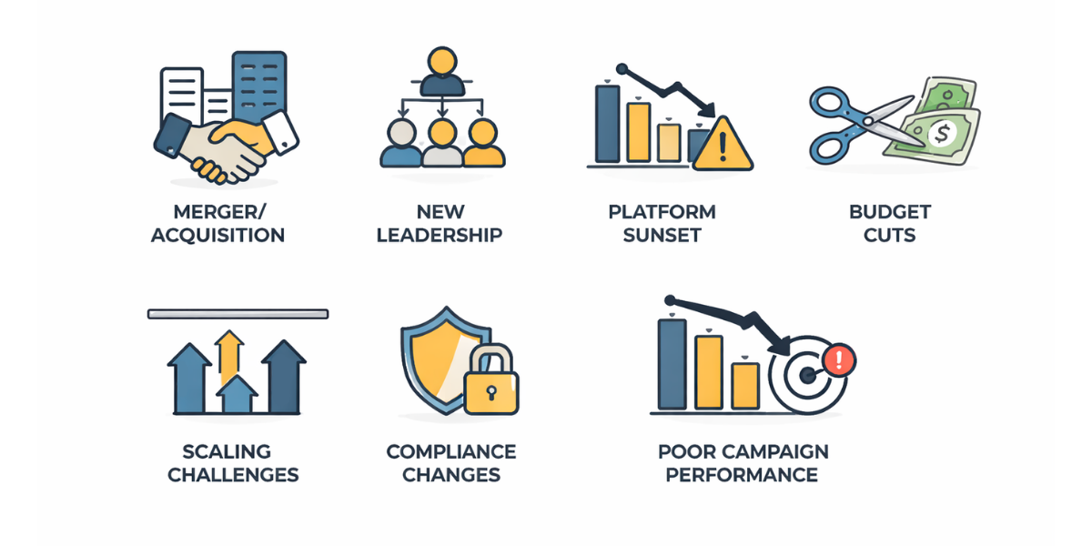 - Strategic pivot or new market entry – Entering a new segment or pivoting your go-to-market often requires different MarTech capabilities than your current stack provides.