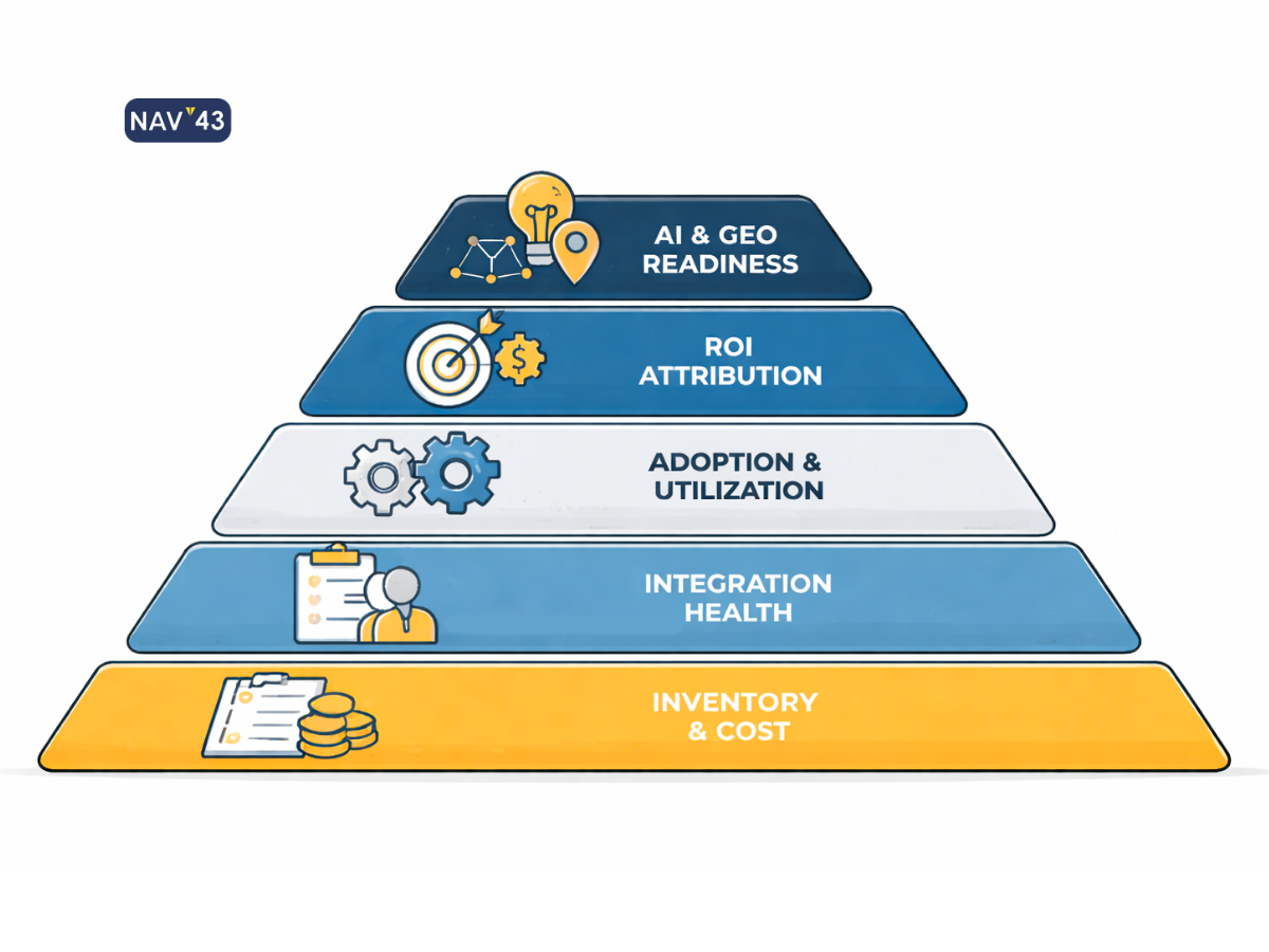 A MarTech stack audit isn’t a cost-cutting exercise. It’s a revenue recovery opportunity. This article delivers the NAV43 5-Layer MarTech Audit Framework: a systematic approach to evaluating whether your stack is generating pipeline or just generating invoices. If you’re a marketing manager questioning tool ROI, a RevOps lead drowning in integration complexity, or a CMO preparing for board-level budget discussions, this framework will show you exactly where your stack is leaking value.
