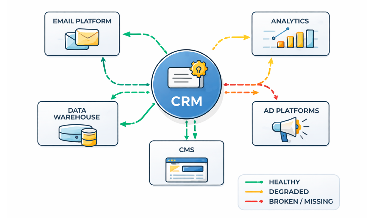 When I audit integration health, I look for warning signs of “duct tape” architecture: Zapier chains connecting tools that should have native integrations, CSV exports scheduled for manual upload, and middleware solutions that exist only to bridge gaps between poorly chosen platforms. These workarounds introduce latency, create failure points, and consume admin hours that should be spent on strategy.