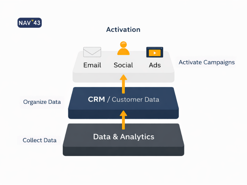 Data flows upward through each layer. Your CRM captures and stores customer data. Automation tools use that data to trigger workflows and nurture sequences. Engagement tools push messages out to channels. Analytics tools measure what happened and feed insights back down to inform strategy.