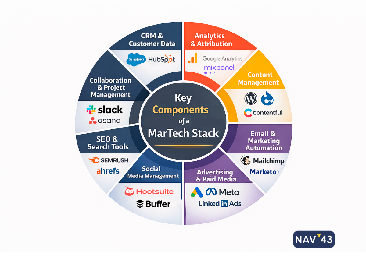 I’ve spent the last decade helping mid-market B2B companies untangle their martech messes at NAV43. What I’ve learned is that the best stacks aren’t the biggest. They’re the most integrated and the most utilized. In this guide, I’ll show you exactly what winning martech stack examples look like, broken down by company size, complete with visual diagrams and the framework we use with clients to build stacks that actually drive revenue.