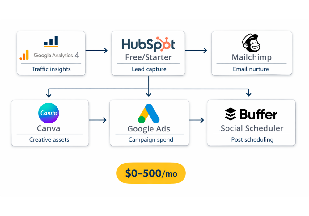 | Analytics | Measurement, attribution, reporting | Google Analytics 4, Looker, HubSpot Reporting |
