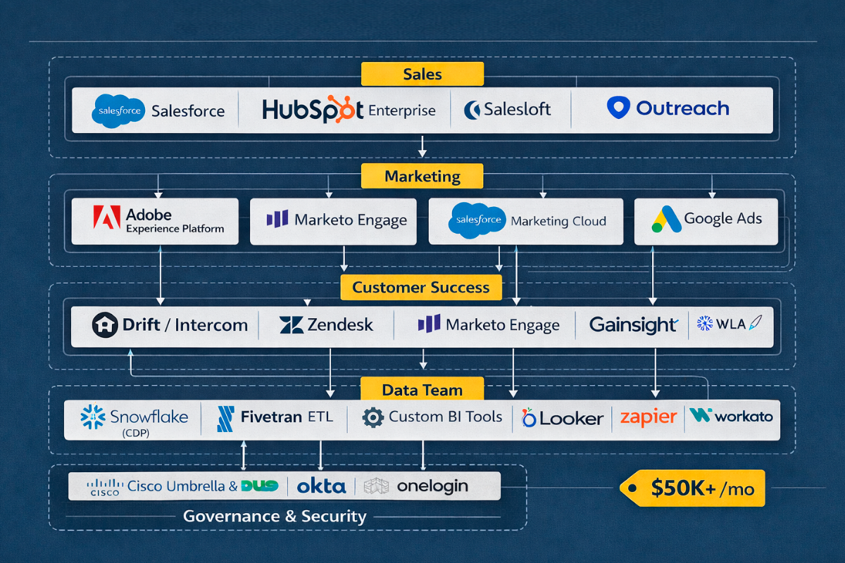 Enterprise stacks require governance layers that mid-market companies often skip. Who owns each tool? What’s the data dictionary? What are the SLAs for integrations? Without clear answers, enterprise stacks devolve into chaos.
