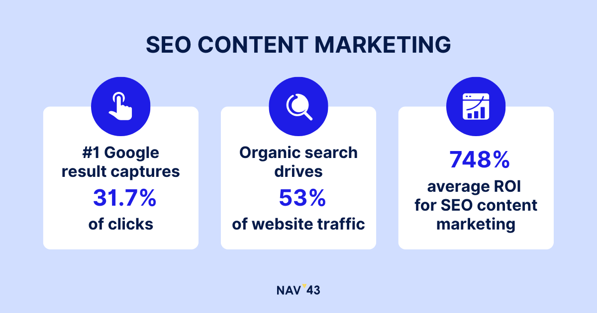 The stakes are significant. According to recent data, the average #1 Google result captures 31.7% of clicks, while positions 2-10 combined get less than that. Meanwhile, organic search drives 53% of all website traffic – more than paid search and social combined. Companies investing in strategic SEO content marketing see an average ROI of 748%, far exceeding most digital marketing channels.