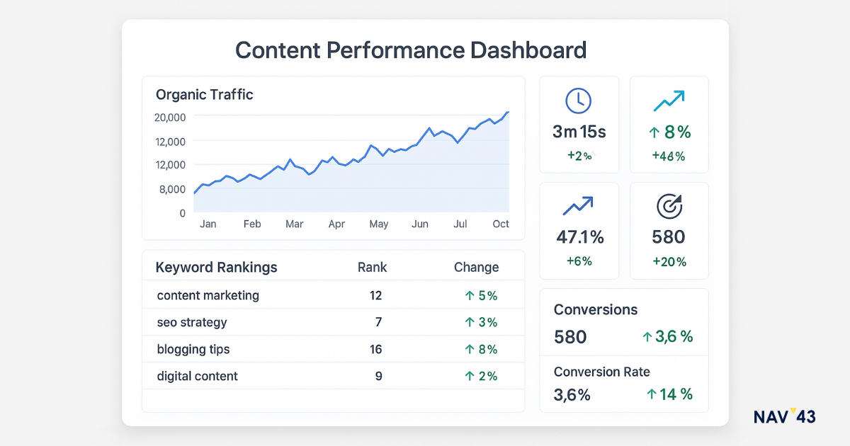 Track metrics that matter for business impact, not vanity statistics. Organic traffic growth, keyword rankings, and backlinks indicate SEO success, but conversion rates, qualified leads, and revenue attribution prove ROI. Build dashboards connecting content performance to business outcomes.